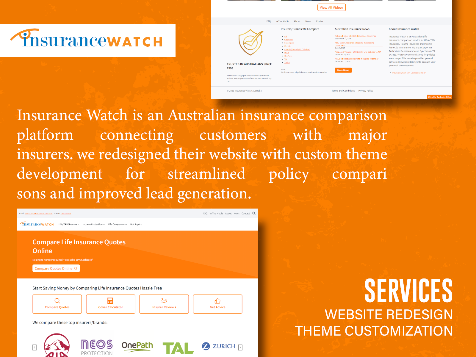 Insurance Watch is an Australian insurance comparison platform connecting customers with major insurers. we redesigned their website with custom theme development for streamlined policy comparisons and improved lead generation