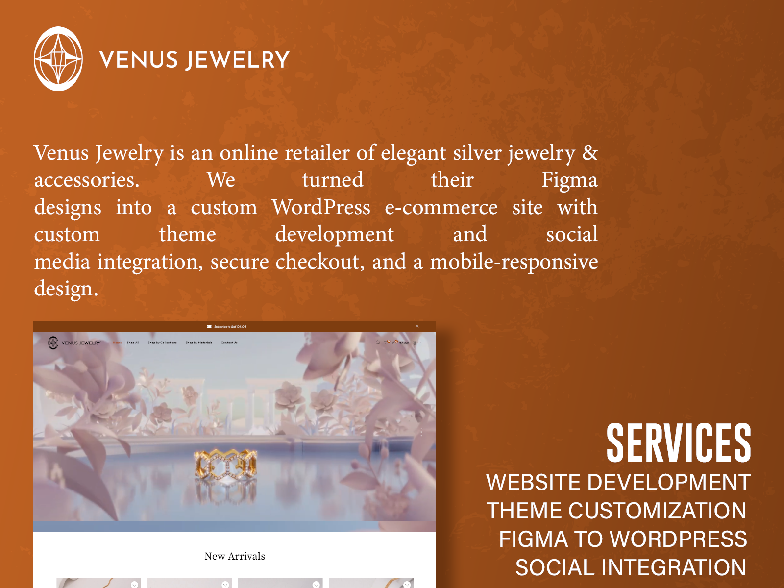Venus Jewelry is an online retailer of elegant silver jewelry & accessories. We turned their Figma designs into a custom WordPress e-commerce site with custom theme development and social media integration, secure checkout, and a mobile-responsive design.
