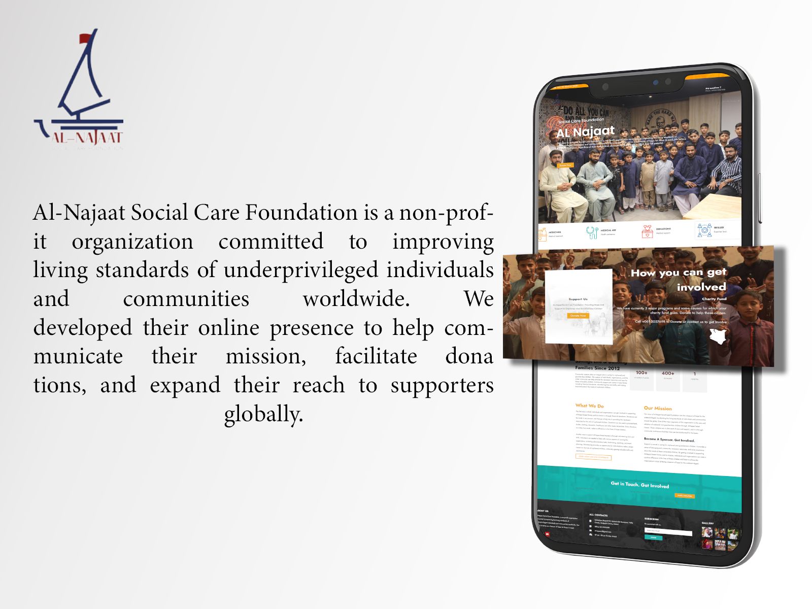 Al-Najaat Social Care Foundation is a non-profit organization committed to improving living standards of underprivileged individuals and communities worldwide. We developed their online presence to help communicate their mission, facilitate donations, and expand their reach to supporters globally.