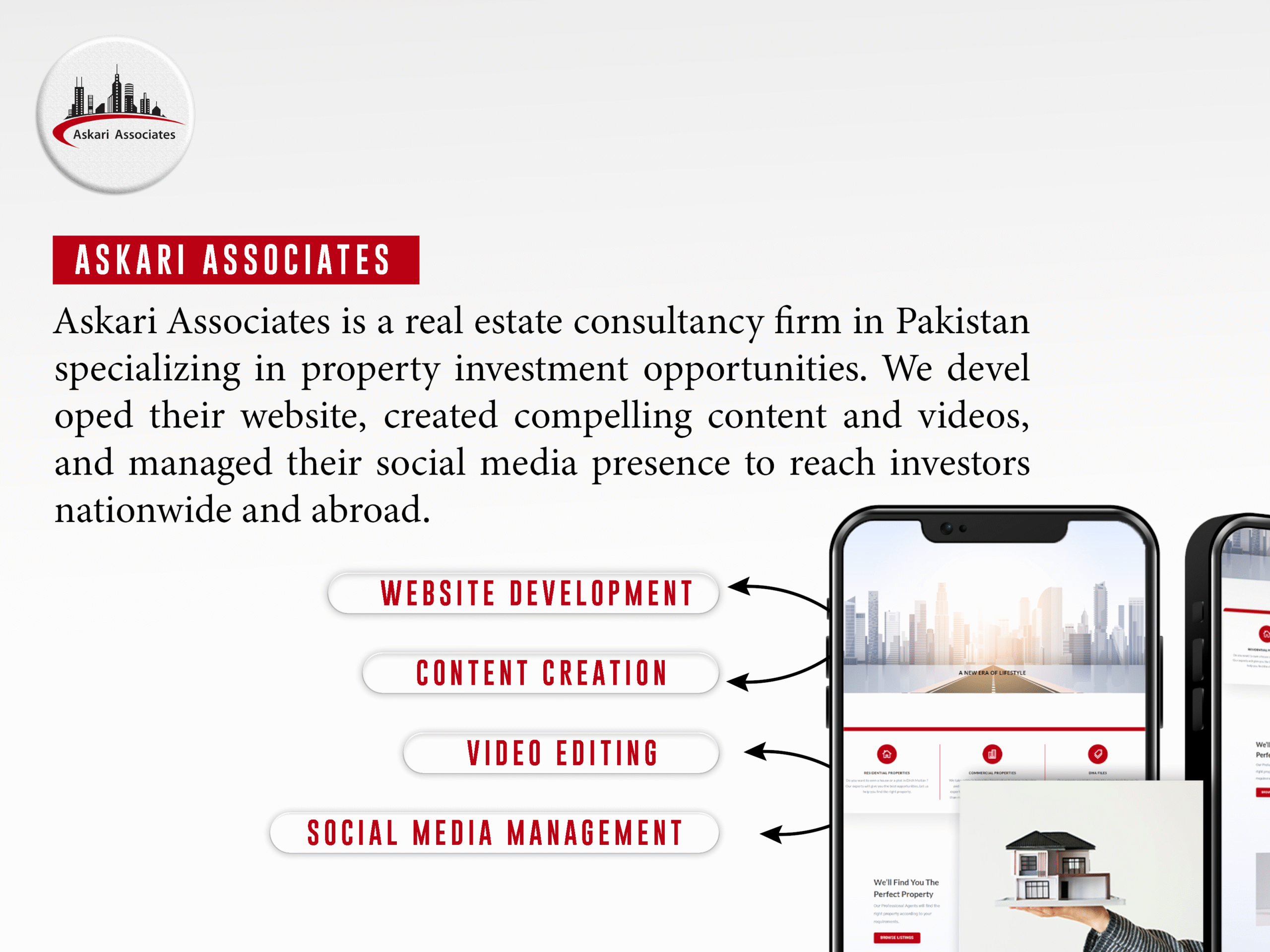 Askari Associates is a real estate consultancy firm in Pakistan specializing in property investment opportunities. We developed their website, created compelling content and videos, and managed their social media presence to reach investors nationwide and abroad.