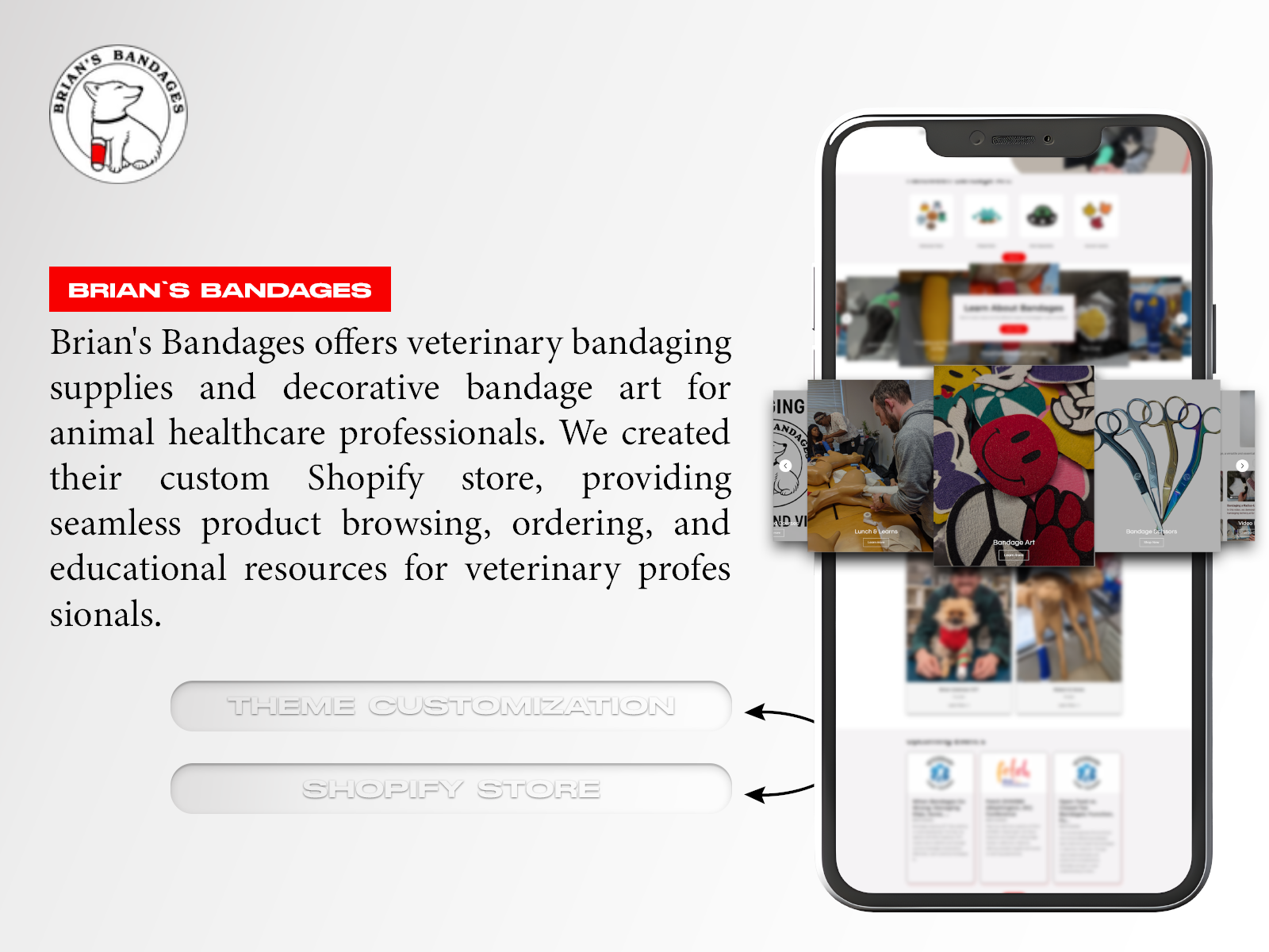 Brian's Bandages offers veterinary bandaging supplies and decorative bandage art for animal healthcare professionals. We created their custom Shopify store, providing seamless product browsing, ordering, and educational resources for veterinary professionals.