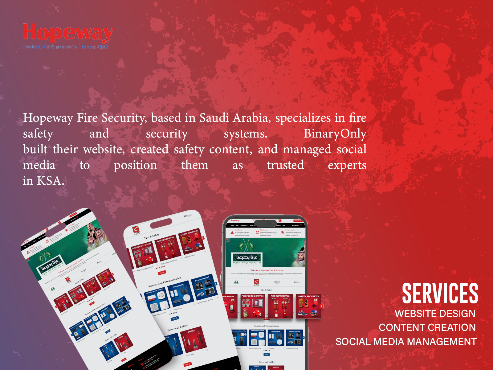 Hopeway Fire Security, based in Saudi Arabia, specializes in fire safety and security systems. BinaryOnly built their website, created safety content, and managed social media to position them as trusted experts in KSA.
