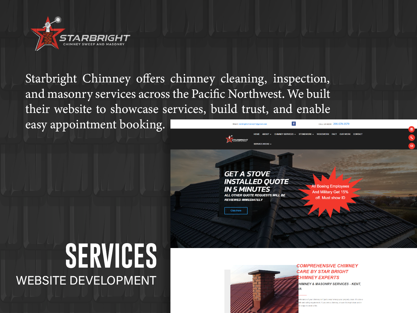 Starbright Chimney offers chimney cleaning, inspection, and masonry services across the Pacific Northwest. We built their website to showcase services, build trust, and enable easy appointment booking.