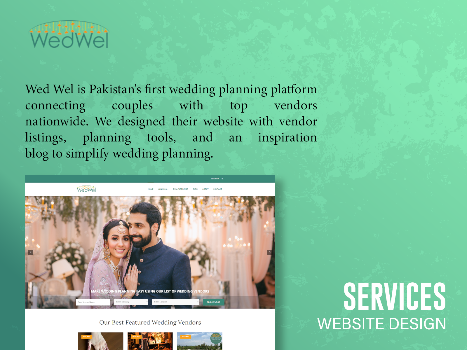 Wed Wel is Pakistan's first wedding planning platform connecting couples with top vendors nationwide. We designed their website with vendor listings, planning tools, and an inspiration blog to simplify wedding planning.